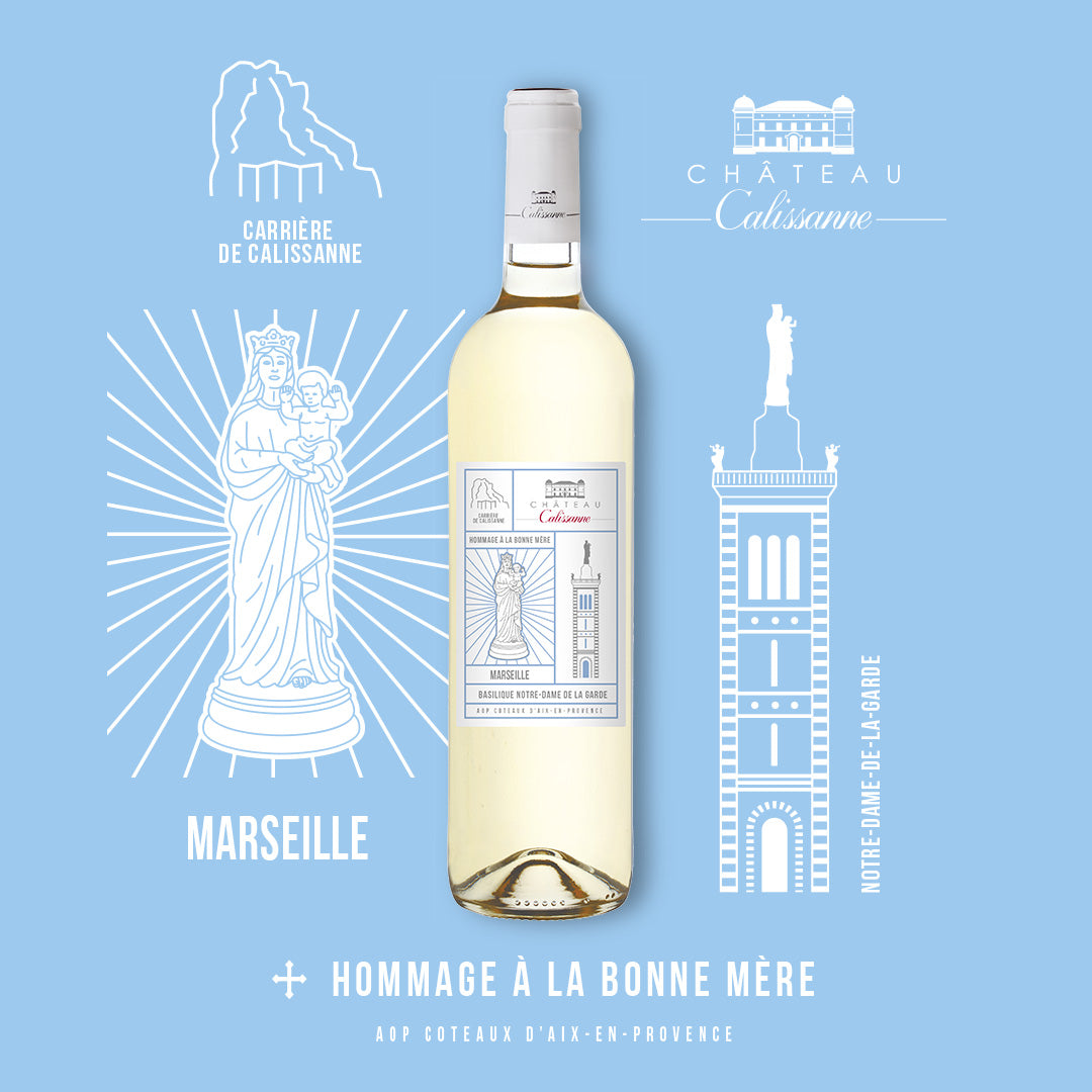 Cette cuvée solidaire, « Hommage à la Bonne Mère », est destinée à participer à la restauration de la statue de la Vierge Marie, située au sommet de la basilique Notre-Dame de la Garde. Ce monument emblématique de Marseille fut édifié en 1852 avec des blocs de pierre calcaire provenant des carrières historiques du domaine, comme ce fut aussi le cas pour la cathédrale La Major au cours de la même période.